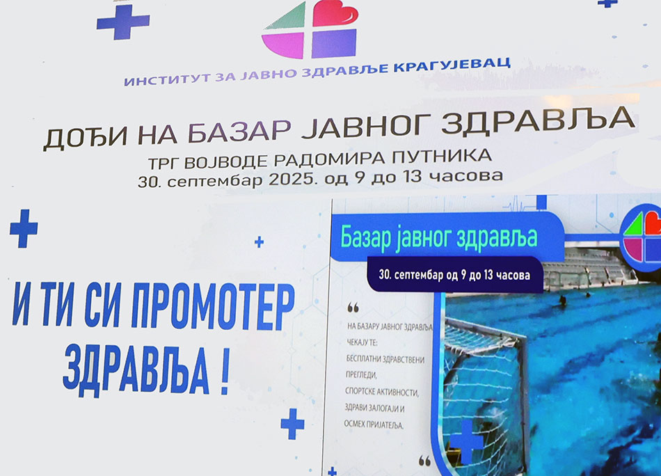 У организацији Института за јавно здравље Центра за промоцију здравља, уз учешће других здравствених установа у Граду и Факултета медицинских наука у уторак 30. септембра на Тргу Војводе Радомира Путника биће одржана манифестација „Базар јавног здравља“. Циљ ове пре свега здравствено-превентивне манифестације, која се реализује уз подршку Града Крагујевца је очување здравља наших суграђана у чему пресудну улогу имају превентивни прегледи и развијање здравих стилова живота. Према речима организатора Центра за промоцију здравља ИЗЈЗ учесници ће бити лекари, специјализанти ФМН, студенти, невладине и спортске организације. Како је истакла проф. др Ивана Симић Вукомановић начелница Центра за промоцију здравља ИЗЈЗ , иначе професор на катедри за социјалну медицину ФМН, сви грађани ће моћи да обаве бројне бесплатне здравствене прегледе тог дана- од провере нивоа шећера у крви, крвног притиска, сатурацију, ултразвука абдомена до упућивања на мамографију и све скрининге на карциноме који се спроводе у нашем граду и то само уз личну карту. Симић Вукомановић је најавила и да ће уз подршку Градске туристичке организације за учеснике бити припремљени и здрави оброци и додала да очекује учешће наших суграђана свих животних доби-од малишана до најстаријих.