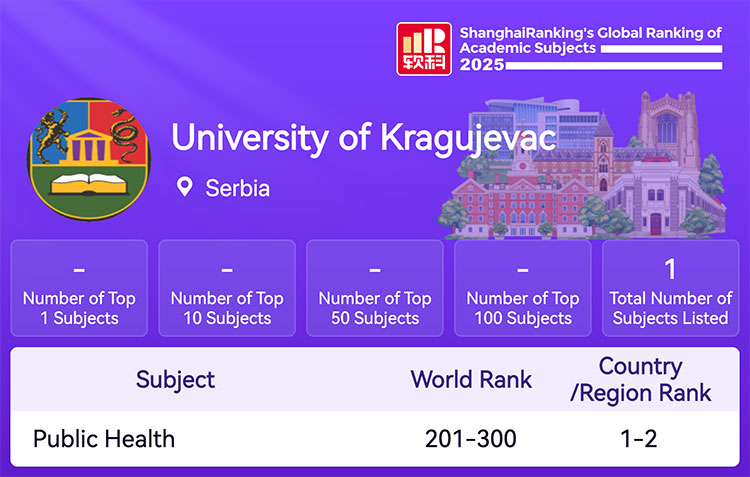 Захваљујући резултатима истраживача Факултета медицинских наука Универзитета у Крагујевцу, ова високошколска установа позиционирала се у групи од 201. до 300. места у области Јавно здравље. Овај пласман представља значајно признање за континуирани научно-истраживачки рад и квалитет који Факултет медицинских наука показује на међународном нивоу.